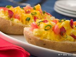 Evenly divide eggs into potato halves and sprinkle with tomatoes, bacon, cheese, and scallions. Place on baking sheet and heat in oven 5 minutes, or until cheese is melted.