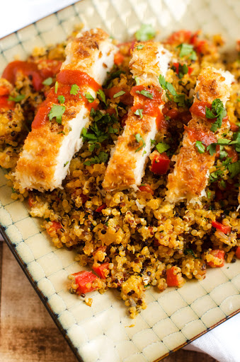 Pound chicken thin and dredge in arrowroot mixture. Dip in egg and then dredge in coconut quinoa mixture.