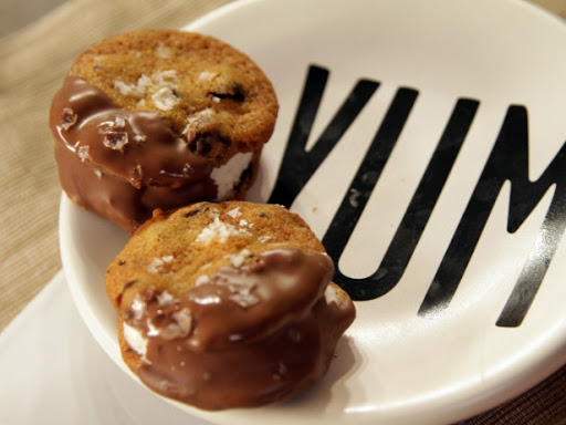 When the sandwiches are hard, dip half of the cookie into melted milk chocolate to coat it, and garnish with some sea salt.
