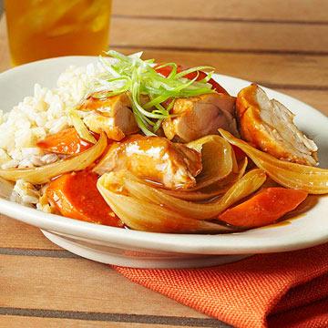 Five minutes before serving, cook frozen rice in microwave according to package directions. Serve chicken and sauce over rice; if desired, sprinkle with green onion.