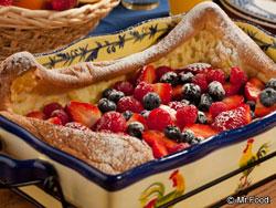 Bake 25 to 30 minutes, or until golden brown and center is set. Top with berries and sprinkle with confectioners' sugar. Slice and serve immediately.