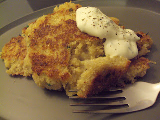 While the cakes drain, cook pancetta top cakes with sour cream and Pancetta