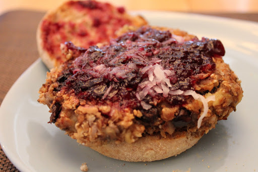 Top with fresh berries, jelly or more nut butter. The little bit of chocolate was amazing in this. Nice + melty. Kelsey and I both looooved it! It was super filling too on the Ezekiel sprouted grain muffin!