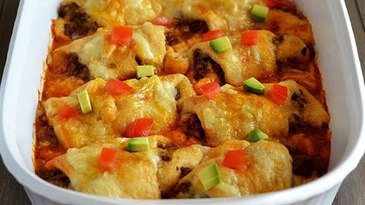Separate dough into 8 triangles. Place 2 tablespoons beef mixture on wide end of 1 triangle. Roll up, starting at shortest side of triangle, rolling to opposite point. Place each filled crescent into baking dish. Repeat with remaining triangles and beef mixture.