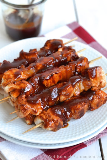 Add all the sauce ingredients in a saucepan and whisk to combine. Bring to a boil and then reduce to low heat. Cook until sauce has reduced by about a half and reaches a thick consistency, whisking often. This should take about 15 minutes. Keep an eye on it to make sure it doesn't burn. Reserve one third of the sauce for serving and keep the remaining sauce to cook the skewers.