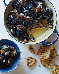 Add the cream, saffron and citrus zests and bring to a boil. Reduce the heat and simmer until thickened slightly, about 3 minutes. Stir in the butter until melted, then stir in the mussels until heated through. Season with salt and pepper and serve with grilled bread.