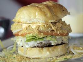 Toast the burger bun on the grill. Top with the burger. Add the provolone cheese, lettuce, tomato, onion, mustard, ketchup, pineapple sauce and crushed potato chips.