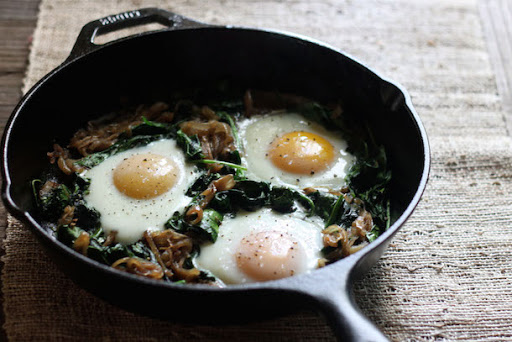 When onions are done, set the oven broiler to Low and move the rack to the middle if it’s not there already. Add greens to the skillet and continue to cook on the stove until wilted. The amount of time will vary depending on the type of greens you use. Form 3 wells for the eggs. Crack one egg into each well and cook for 3-4 minutes until whites start to set. Sprinkle with cheese before transferring to oven and broil eggs until they are cooked to your liking.