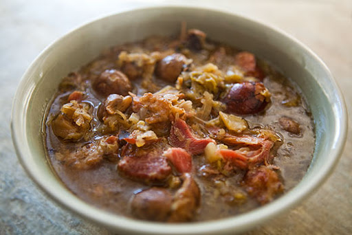 1 Pour hot tap water over the dried mushrooms and submerge them for 20-40 minutes, or until soft. Grind or crush the juniper berries and black peppercorns roughly; you don’t want a powder. Cut the pork shoulder into large chunks, about 2 inches. Cut the sausages into similar-sized chunks. Drain the sauerkraut and set aside. Clean off any dirt from the mushrooms and cut them into large pieces; leave small ones whole.