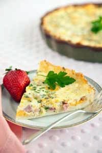 5. When the hash brown crust is ready pour the egg mixture over it and return to the oven. Lower the oven temperature to 350F and bake for about 30 mins until the quiche is light golden brown on top and puffed.