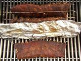Smoke for 4 to 5 hours then test for doneness. There are four criteria that should be met in order for ribs to be done. First, the internal temperature of the meat should be 185 to 190 degrees F. Second, pick up each slab from the center with tongs and it should droop into a u-shape and crack slightly. Third, while holding with the tongs, and bouncing gently, the surface of the ribs should crack slightly. Lastly, the meat should pull easily off the bone but not fall off. If ribs pass all tests, remove them from the smoker and wrap in heavy-duty foil and rest for 15 minutes. If not, continue smoking for 45 minutes to 1 hour and test again until done.