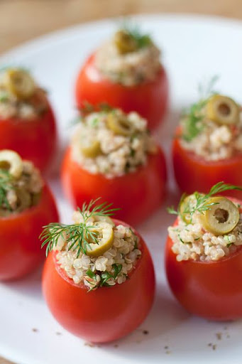 In the bowl, combine the tomato pulp/seeds with cooked quinoa, capers/olives, chopped dill and scallions. Add lime/lemon juice and mix well