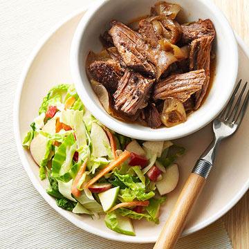 Cover and cook on low-heat setting for 9 to 10 hours or on high-heat setting for 4 1/2 to 5 hours. Transfer meat to a cutting board. Slice meat across the grain. With a slotted spoon remove the onions from the cooking liquid. Serve with meat.