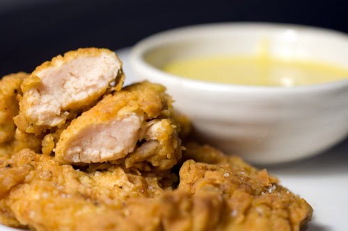For this recipe, I marinate chicken tenders in some buttermilk and cajun seasoning and then dredge them in flour seasoned with even more cajun seasoning. To top it off, I dip them in a sweet homemade honey mustard dressing. Tender chicken with a little crunch, a little spice and a little sweet, what more could you want?