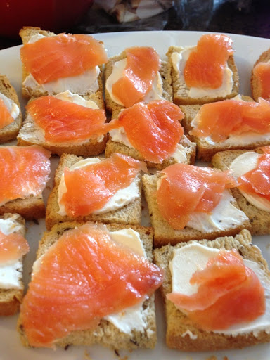 4. Spread 1 tsp or so cream cheese on each piece of rye bread and top with lox.