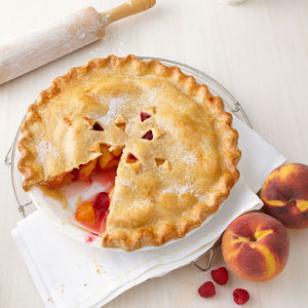 Meanwhile, prepare filling: Combine peaches, raspberries, 2/3 cup sugar and lemon juice in a large bowl; toss well to coat. Let stand for 5 minutes. Transfer the fruit mixture to a colander set over a medium bowl and let drain for 30 minutes. Pour the collected juice into a small saucepan. Return the fruit to the large bowl. Bring the juice to a boil over high heat and cook, gently swirling the pan, until reduced, syrupy and slightly darkened in color, 3 to 4 minutes. Add the syrup to the fruit along with cornstarch; gently toss until the cornstarch is completely dissolved.