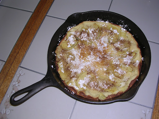 Position rack in middle of preheated 450 oven. Melt butter in a medium skillet over medium heat, then transfer 1 T to a blender. Add the apple wedges to the skillet and cook, turning once until they start to soften 3 to 5 minutes. Arrange wedges around the edge of skillet. Meanwhile mix milk, flour, eggs, sugar, vanilla, and salt with the butter in the blender until batter is smooth. Pour over the apples in the skillet and bake for 15 minutes or until pancake is puffed and golden. Dust with confectioners' sugar and eat immediately.