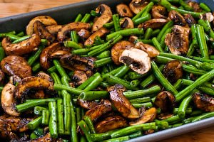 4. Roast 20-30 minutes, starting to check for doneness after 20 minutes. Cook until beans are tender-crisp, mushrooms are cooked, and all liquid on the pan from mushrooms has evaporated.