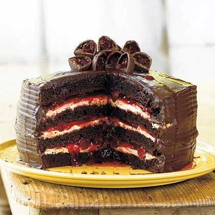 Devil's food cake layers enriched with milk chocolate and a trio of extracts are sandwiched with the simplest and most decadent stuffing of them all--ready-to-eat cheesecake filling and cherry pie filling. Capped off with fudge frosting and gooey chocolate-covered cherries, it's a cinch to wow your guests.