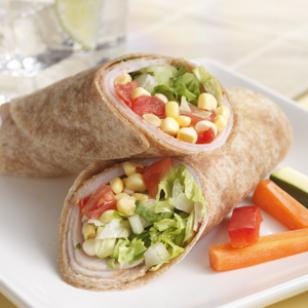 Fresh corn kernels, tomatoes and lettuce fill these hearty turkey wraps. This wrap is great for picnics or when you need to have dinner on the run. Add some crumbled feta or shredded Cheddar for another layer of flavor. Serve with carrot sticks, sliced bell pepper or other crunchy vegetables plus your favorite creamy dressing.