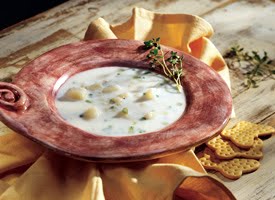 Stir the milk, salt, pepper, thyme and onions into the potato mixture. Heat over medium heat, stirring occasionally, until hot and steaming, but do not let the soup boil.