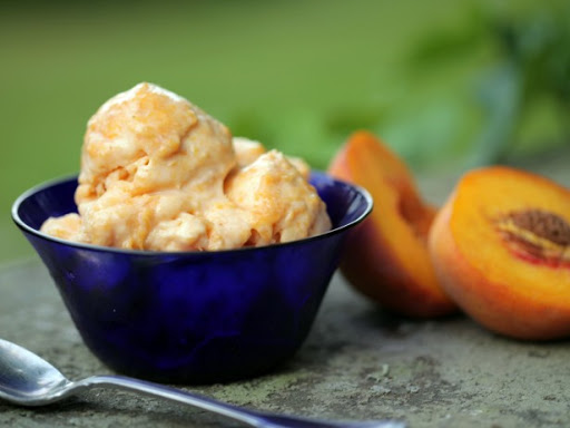 Pour the peach mixture into the canister of your ice cream machine and cover the top securely. Place the canister carefully in the machine, and then pack layers of crushed ice and kosher salt around the canister, until it is surrounded almost to the top. Place the motor on top of the machine and start it. Let the machine run for about 20 minutes, until the ice cream is finished churning and the machine slows.