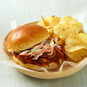 5. Remove pork from slow cooker and allow to cool slightly. With 2 forks or your hands, shred meat, discarding fat and bones. Stir pulled pork into sauce in cooker. Divide evenly among sandwich buns, topping with coleslaw, if desired.