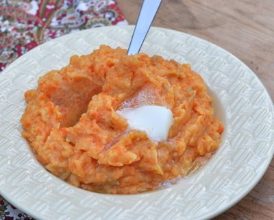 Cut vegetables into 1/2-inch pieces. Place in heavy medium saucepan. Add enough water to cover. Bring to boil. Cook until vegetables are tender, about 12 minutes; drain. Transfer to processor; add butter and process to coarse puree. (Alternatively, return vegetables to same pan; add butter and mash to coarse puree.) Season with nutmeg, salt and pepper and serve.
