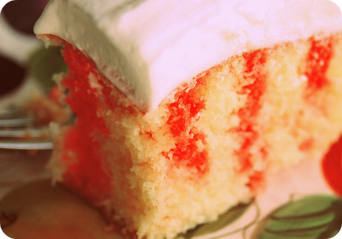Dissolve jello in 3/4 C. boiling water. Add 1/2 C. cold water; set aside at room temperature. Mix and bake cake as directed on pkg. (using egg whites) and place batter in a greased and floured 9 x 13 pan. Bake as directed. Cool for 20 - 25 mins. Poke deep holes through top of warm cake (still in pan) with meat fork or toothpick; space holes about 1/2 inch apart. With a cup, slowly pour gelatin mixture into holes. Refrigerate cake while preparing topping.