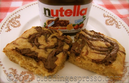 5. Swirl Nutella into top of mixture. I didn’t use any particular technique other than swirling it around with a knife. Martha Stewart would’ve been appalled, I’m sure.