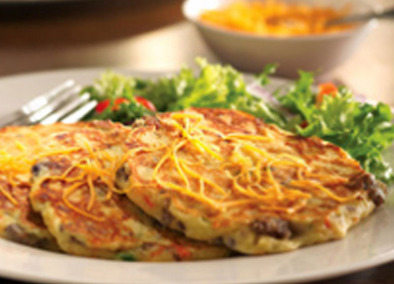 Combine baking mix, milk, eggs and pepper in medium bowl; stir until moistened. Add potatoes au gratin, sausage, cheese and green onions; gently stir until combined.