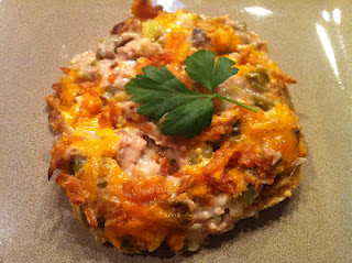 In a glass baking dish, fork mash the head of cauliflower until it creates a thick layer covering the entire baking dish