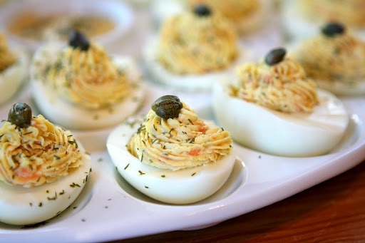 2. Pipe the filling into the egg halves, using a large star tip, and then top each with a caper at the peak, plus a tiny piece of smoked salmon, if desired.