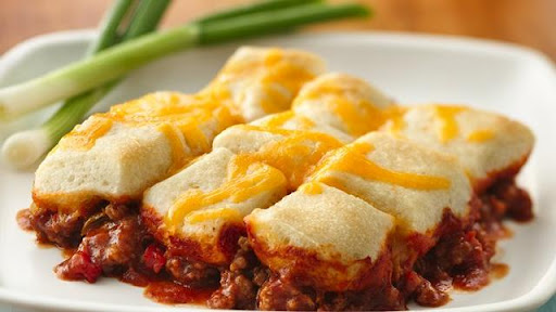 3 Pour beef mixture into ungreased 12x8-inch or 11x7-inch (2-quart) glass baking dish. Place dough pieces in single layer over beef mixture.