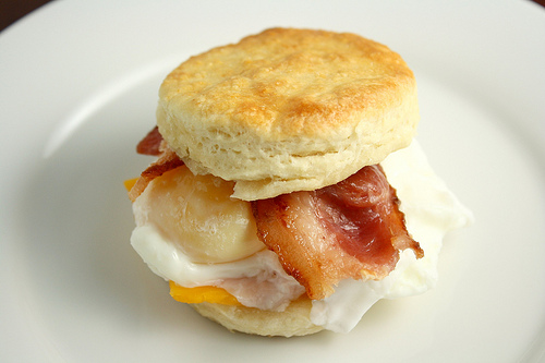 Place on a greased baking sheet close together (so they rise up not out). Brush each biscuit with a bit of egg wash and bake for 15 minutes or until the tops are golden brown.