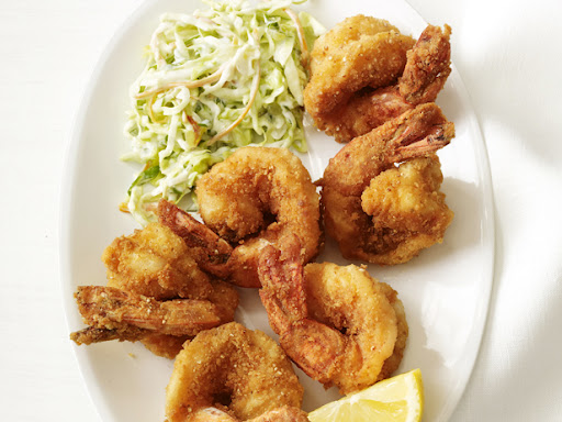 Heat 3/4 inch vegetable oil in a large heavy-bottomed skillet over high heat until a deep-fry thermometer registers 350 degrees F. Fry the shrimp in batches, turning once, until golden, 1 to 2 minutes. Drain on paper towels and season with salt. Serve with lemon wedges and the slaw.