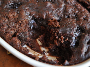Set oven to 350. Stir together ¾ c. sugar, flour, 3 T. cocoa, baking powder and salt. Stir in milk, butter and vanilla, mixing until smooth. Pour batter into an 8" square glass pan. Mix ½ c. sugar, brown sugar, and 4 T. cocoa. Sprinkle evenly over batter. Pour hot water over top. Do not stir. Bake 35 to 40 min or until center is almost set. Let stand 15 min. then serve. Can use chocolate syrup from bottom of dessert to spoon over servings. Serve with ice cream.