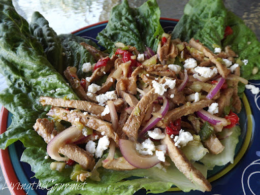 Plate the leaves and top with the pork salad. You may crumble feta, gorgonzola or your favorite choice of cheese on top.