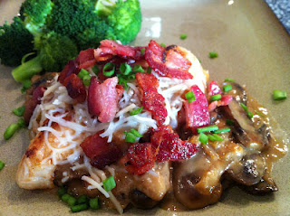 Once the chicken is cooked all the way through, plate it, top with sauce, cheese, bacon and green onions.