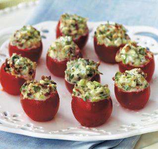Cut a thin slice off the top of each tomato. If desired, cut a thin slice from bottom of each tomato so they'll stand upright. Scoop out and discard tomato pulp; place tomatoes upside-down on a paper towel to drain for 10 minutes. Mix bacon and remaining ingredients in a small bowl; stuff tomatoes. Serve immediately, or chill up to 2 hours.