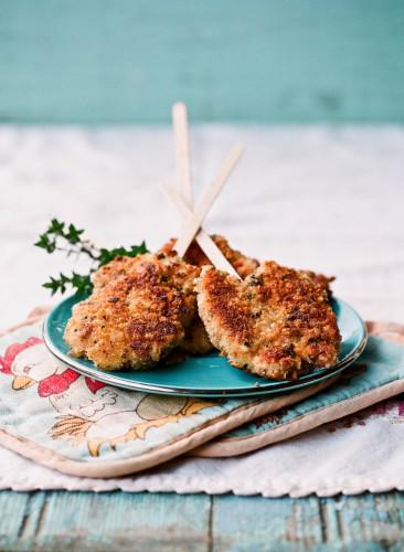 Set out 3 medium bowls. Place flour in one, crack the eggs into the second and beat them, and add panko, Parmigiano-Reggiano, oregano and thyme in the third. Line the three bowls in a row.