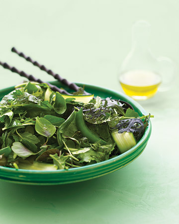 Toss peas, greens, scallions, zucchini, and basil in a large bowl. Whisk together vinegar, oil, lemon juice, ginger, honey, and 1/2 teaspoon salt in a small bowl. Drizzle dressing over salad, and sprinkle with 1/2 teaspoon salt and the pepper. Toss to coat, and serve immediately.