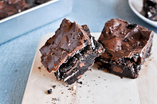 4. Spread in the 8×8 pan. Sink 9 Oreo cookies into the batter and press gently. Bake for 25-30 minutes. While baking, crush the remaining Oreos in a ziplock bag. When brownies are finished baking, remove from the oven and sprinkle with 1/2 cup chocolate chips and crush Oreos. Place back in the oven for about 2-3 minutes. During this time, melt remaining chocolate chips and peanut butter together. Remove brownies from oven and pour melted chocolate mixture over top, spreading with a spatula. Make sure chocolate gets down into the Oreo crevices, as it is the “glue” that holds the top to the bottom. Refrigerate for 2 hours before serving.