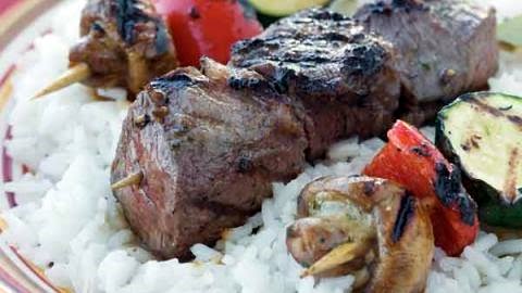 Thread steak cubes on skewers. Broil 4 inches from the heat for 5 minutes; turn and continue to broil for 3–4 minutes or to desired doneness. Toss vegetables with reserved marinade. Skewer and broil about 4 minutes or until done.