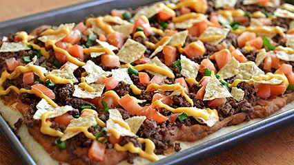 Spread refried beans in partially baked crust. Spread cooked beef evenly over beans. Top beef with tomato and green onions. Sprinkle crushed tortilla chips evenly over tomato and onions. Drizzle nacho cheese sauce all over top.