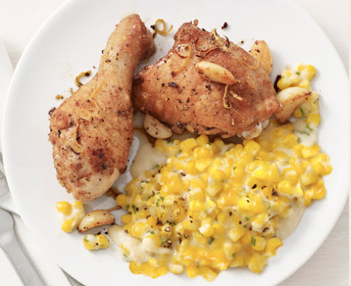 Divide the chicken among plates and drizzle with the pan juices. Serve with the creamed corn.