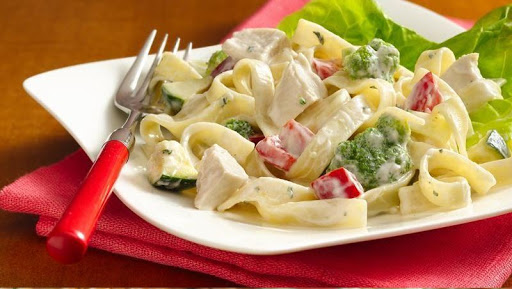 3 In large bowl, stir cooked pasta, chicken, broccoli, zucchini and bell pepper. Spoon sauce over pasta mixture; toss to coat. Cover; refrigerate about 30 minutes before serving.
