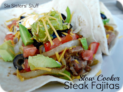 Take meat out of crockpot (I use a slotted spoon) and place meat, onions, green peppers, and whatever other toppings you like on your fajita (I listed what we put on them, but you can usewhatever you like).