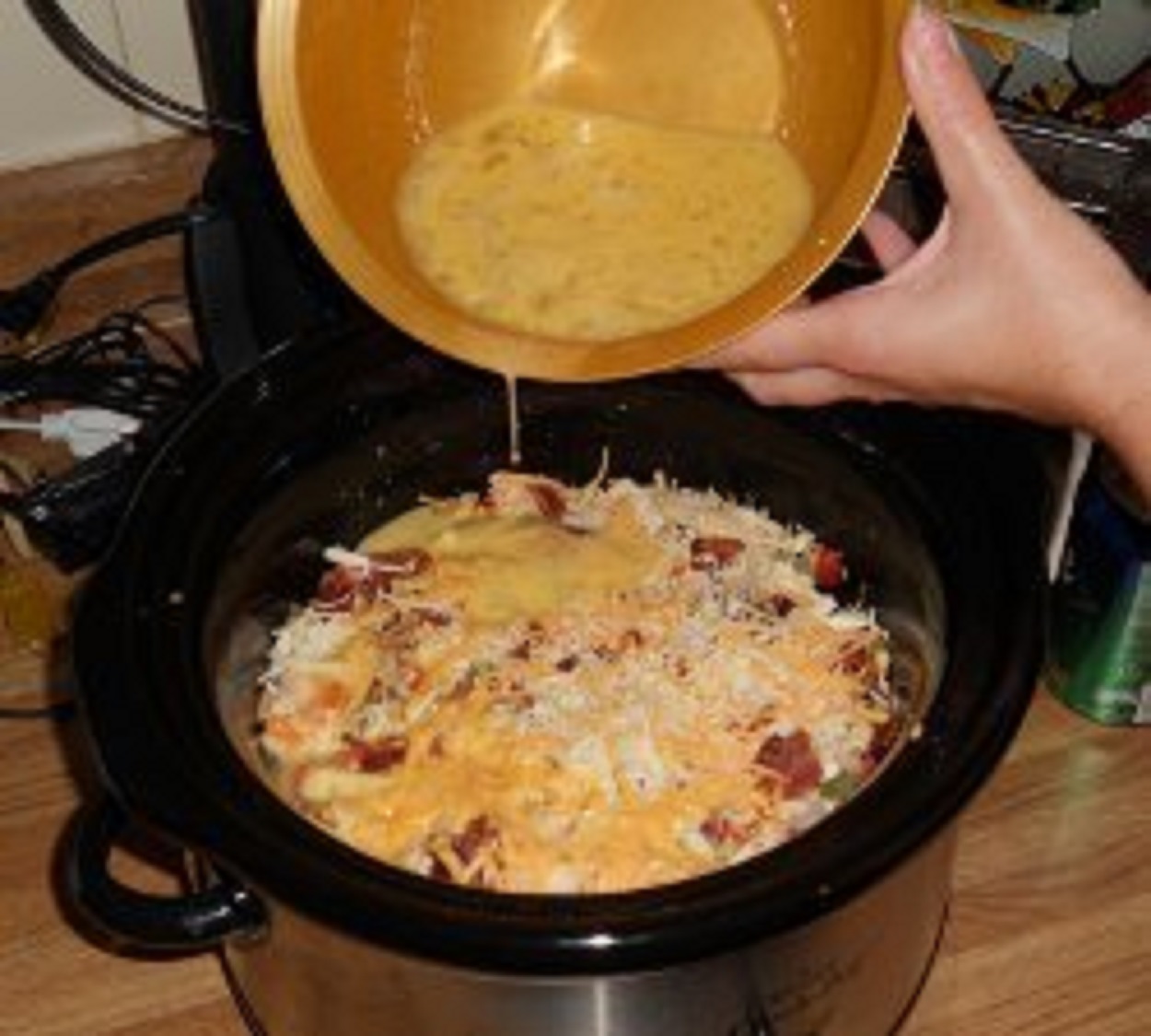 Cook bacon until crisp and cool, then chop into 1/2 inch pieces and then set aside. Sauté onion, garlic, and bell pepper for 5 minutes. Place 1/3 of frozen hash browns in the bottom of the crock pot. Add 1/3 bacon, and 1/3 garlic, onion pepper mixture and 1/3 cheese. Repeat layers ending with cheese.