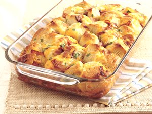 2. Separate dough into 8 biscuits; cut each into quarters. Gently stir biscuit pieces into egg mixture to coat evenly. Fold in bacon, cheese and onions. Spoon mixture into baking dish; arrange biscuit pieces in single layer.